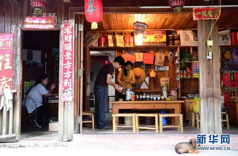 在龙岩市永定区湖坑镇洪坑村土楼群游览区,土楼周边的村民开设了农产品特产店和饮食店来吸引游客消费(5月4日摄)。新华社记者魏培全摄