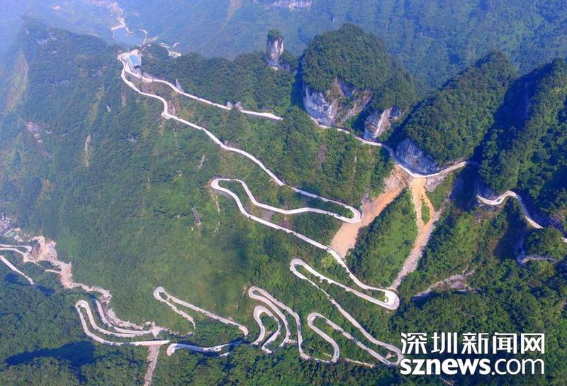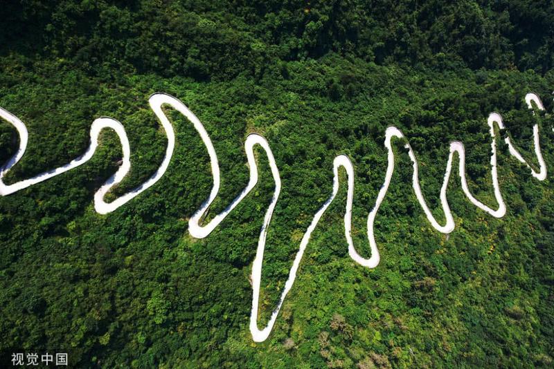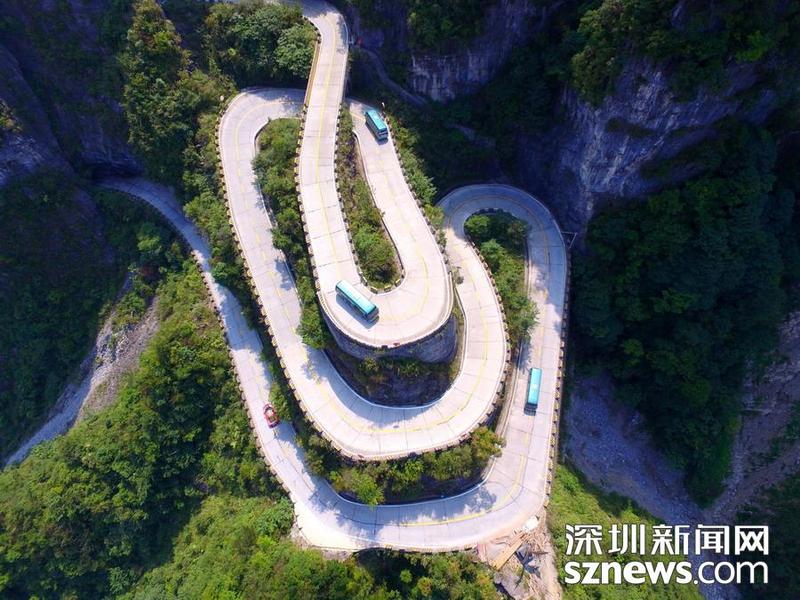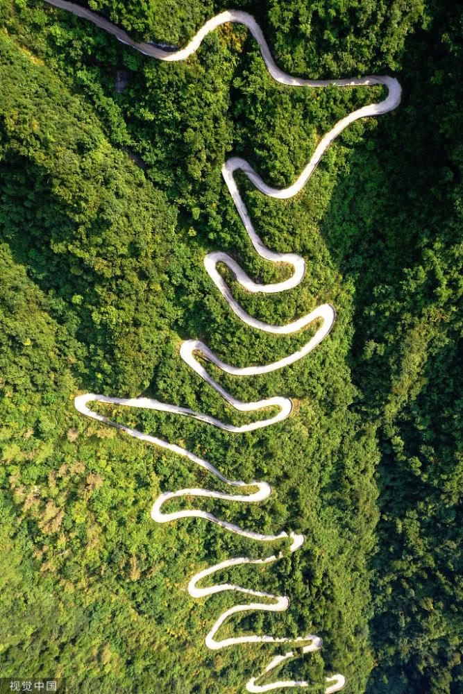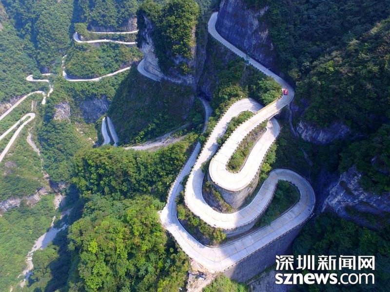 天门山盘山公路位于湖南省张家界市境内的国家森林公园天门山上,盘山公路全长10.77公里,海拔从200米急剧提升到1300米,大道两侧绝壁千仞,空谷幽深,共计99个弯,180度急弯此消彼长,似玉带环绕,航拍镜头下蜿蜒曲折的道路弯弯紧连,层层迭起,宛如迷宫般的“纳斯卡线条”,被誉为“天下第一公路奇观”,同时它也是世界上最危险的十大公路之一。