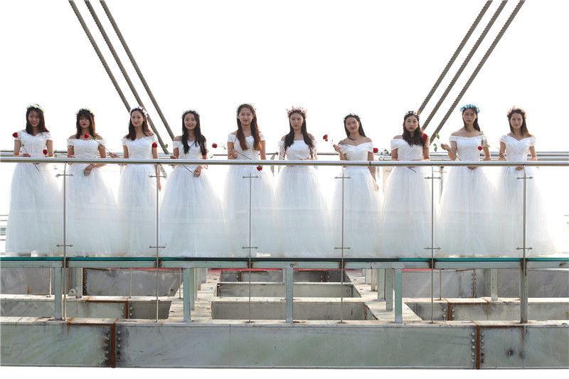 河南南阳:“爱神之箭”高空悬廊开业迎宾百名女生穿婚纱廊桥求真爱