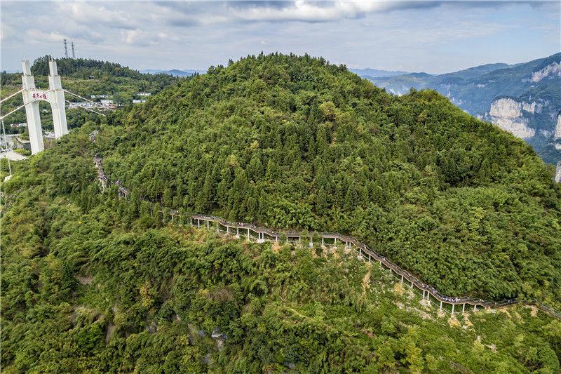 2019年9月13日,游客在重庆市黔江区城市峡谷景区芭拉胡的悬崖栈道上游玩。当天是中秋节假的第一天。杨敏/视觉中国 编辑/陈进