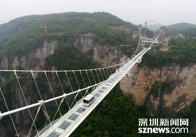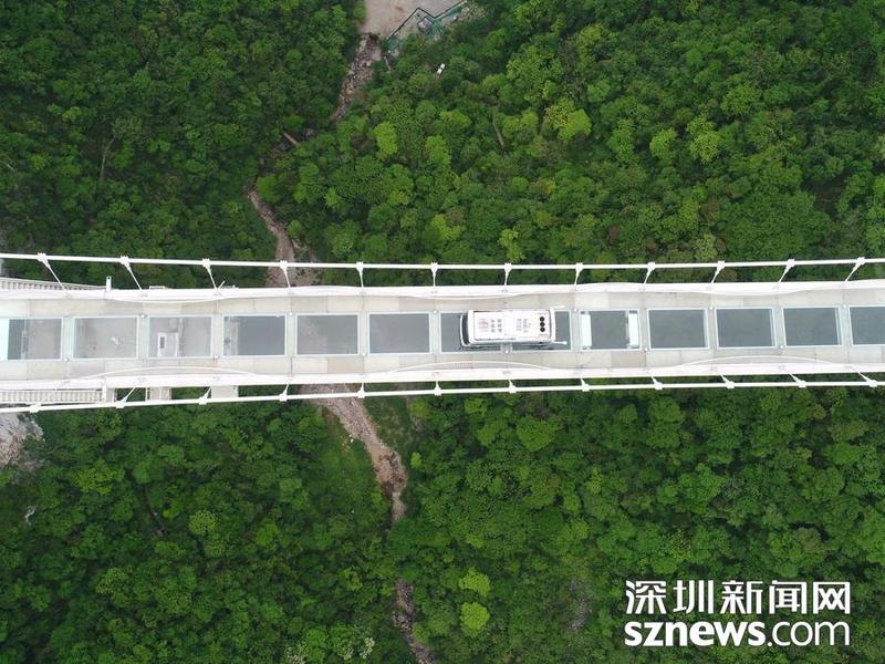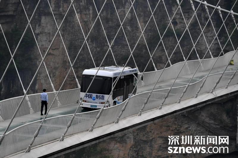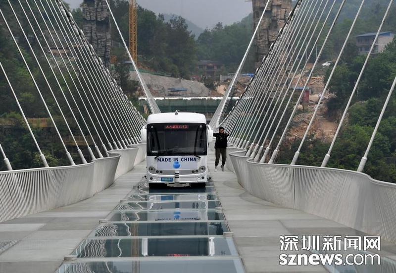 2019年4月24日,湖南张家界大峡谷风景区,无人驾驶巴士在玻璃桥上平稳行驶,中国“巴士悬浮第一人”谈苏阳进行人体悬浮魔幻秀。当天,湖南张家界大峡谷风景区举行无人驾驶巴士挑战高山峡谷玻璃桥活动,一辆重达5.5吨的无人驾驶巴士平稳匀速地从全长430米、宽6米、桥身距离谷底垂直落差300米的全透明玻璃桥上安全通过,标志着国内景区首条无人驾驶公交巴士实际运行线路即将开通。来源:东方IC