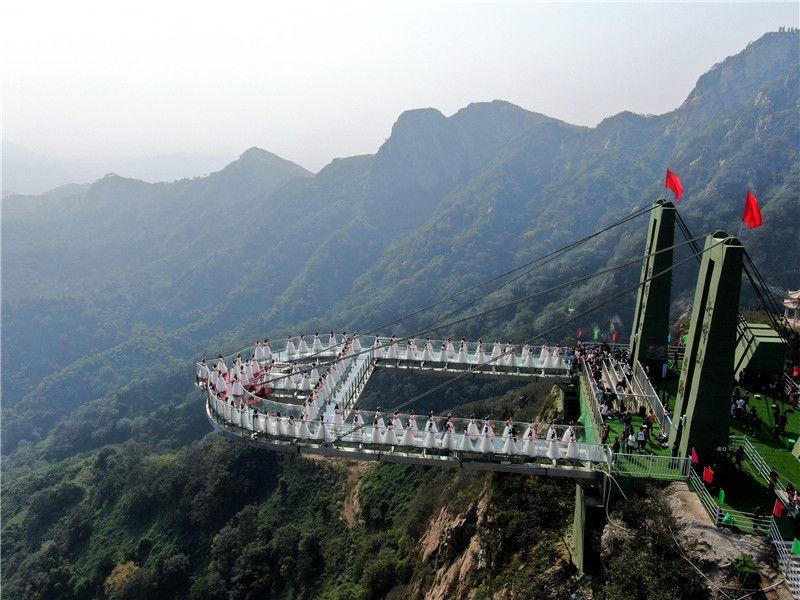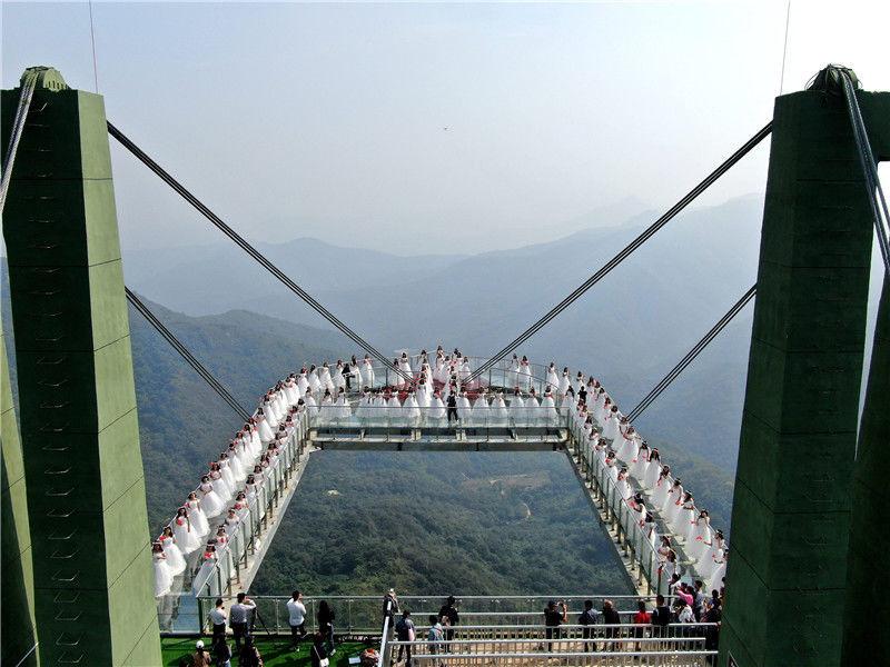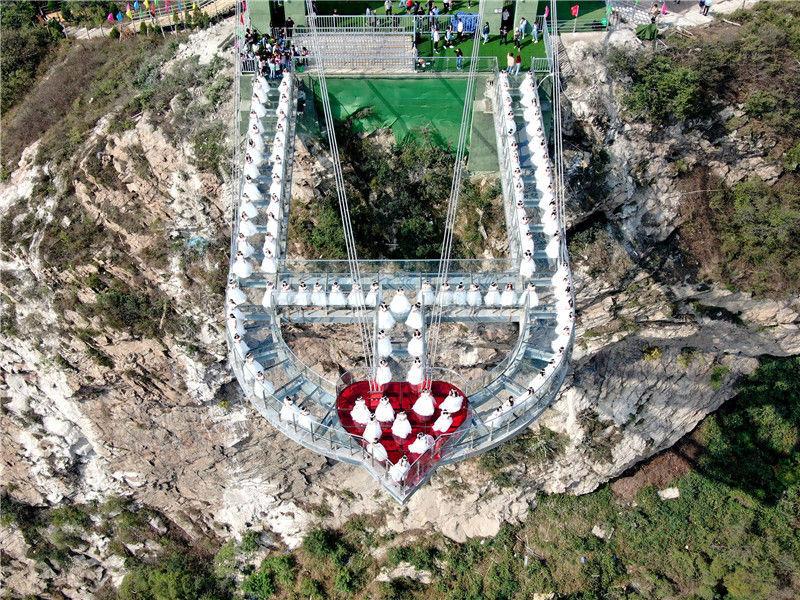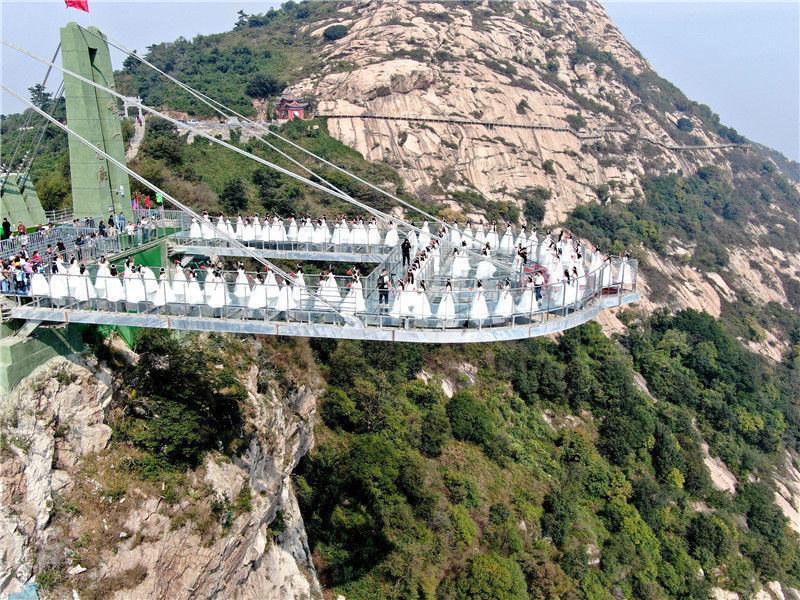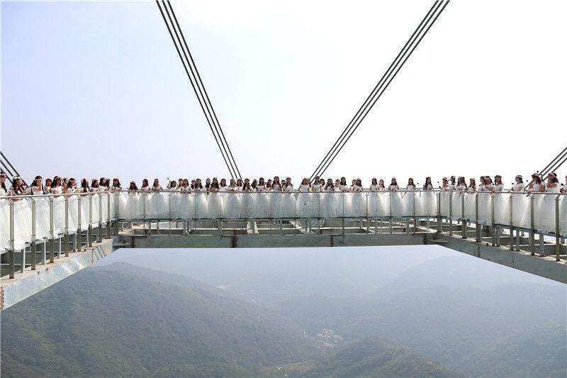 2019年9月21日,河南南阳七峰山绝壁上的高空悬廊开业迎宾,百名女士身着婚纱,手持玫瑰登桥许愿,期待收获一份美好的爱情。该玻璃悬廊,名为“云顶之心”,凌空凸出于绝壁之外,悬崖垂直落差198米。