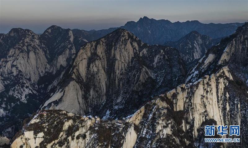 12月4日无人机拍摄的西岳华山。冬日的华山,在夕阳的映照下,绽放出炫目的色彩,与蓝色的天空、金色的晚霞构成壮美的画卷。新华社记者陶明摄