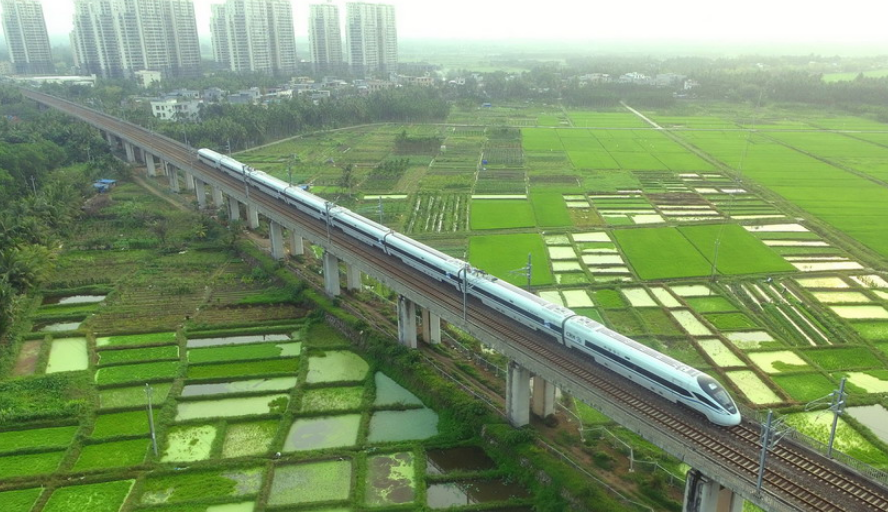 2020年3月17日,海南环岛铁路一列动车从春光明媚的琼海城区经过。