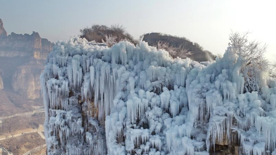 近日,河北省平山县境内的沕沕水景区出现冰瀑美景,形态各异的冰柱悬挂在山麓间,吸引游客前来观赏。