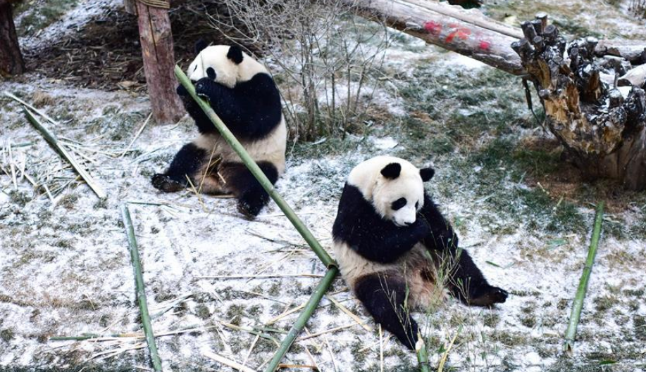 当日,青海省西宁市迎来降雪,西宁熊猫馆四只“萌宠”大熊猫在雪天里享受着吃竹子的乐趣。