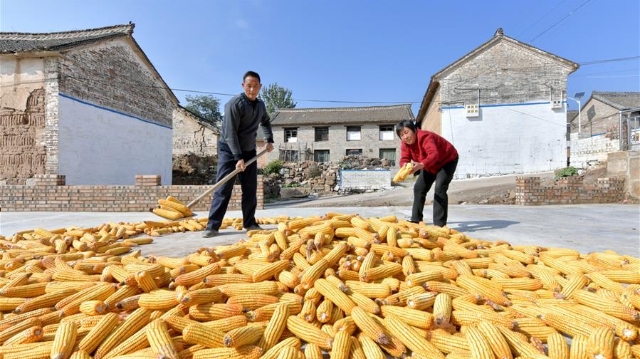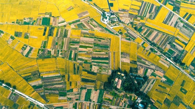 近日,位于太行山下的河北省涉县白芟村上千亩水稻逐渐成熟。从空中俯瞰,犹如一块块“调色盘”,美不胜收。