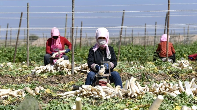 近日,宁夏吴忠市红寺堡区马渠生态移民安置区的7000亩萝卜喜获丰收,农民在田间地头拔萝卜、切萝卜、晒萝卜,一片忙碌。