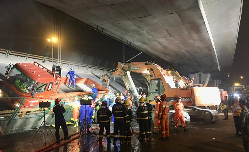 10月10日傍晚,江苏省无锡市一高架桥桥面倒塌,三辆小车被压。