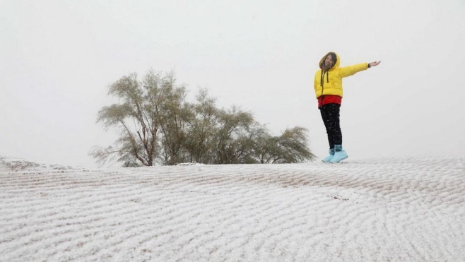 深秋时节,位于腾格里沙漠边缘的宁夏中卫市沙坡头景区迎来一场降雪。漫漫黄沙被覆盖在皑皑白雪之下,呈现出一种别样的美。