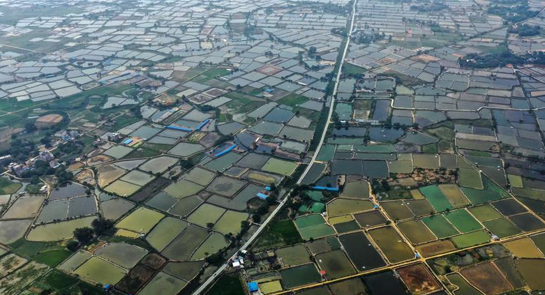 暮春时节,从空中俯瞰广西北海市合浦县大地,河流、稻田、虾塘、道路、村庄星罗棋布、色彩斑斓,美不胜收。