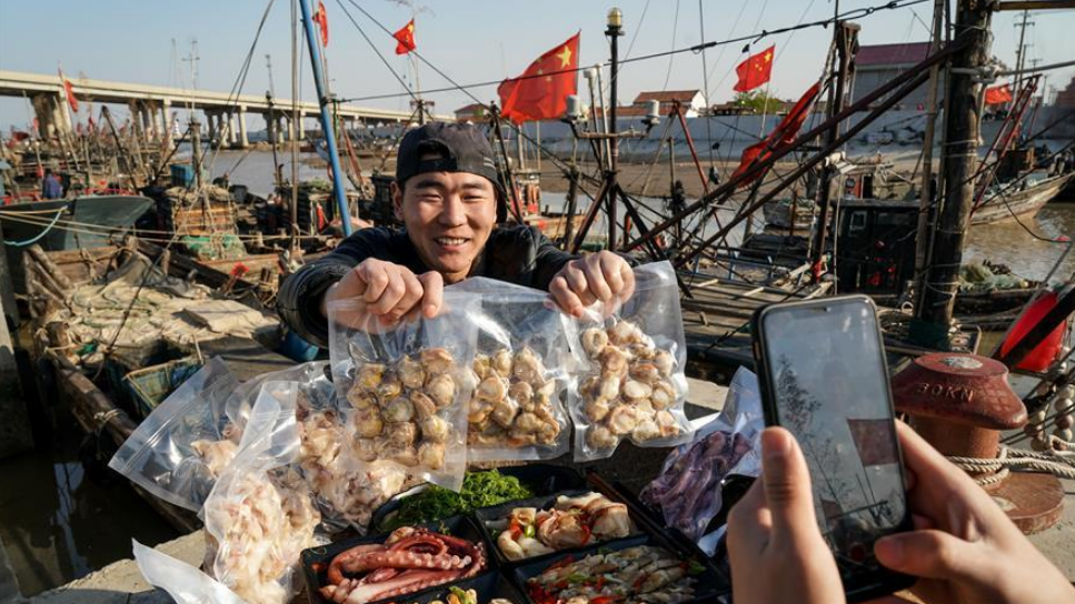 近年来,江苏省连云港市赣榆区海头镇越来越多的居民开始直播销售海产品,当地渔船、码头和市场上活跃着一批网络直播好手。