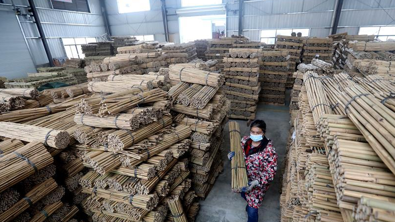 4月24日,在广西融安县农产品加工暨粤桂扶贫协作产业园的一家竹制品外贸企业,工作人员在仓库清点竹制品。