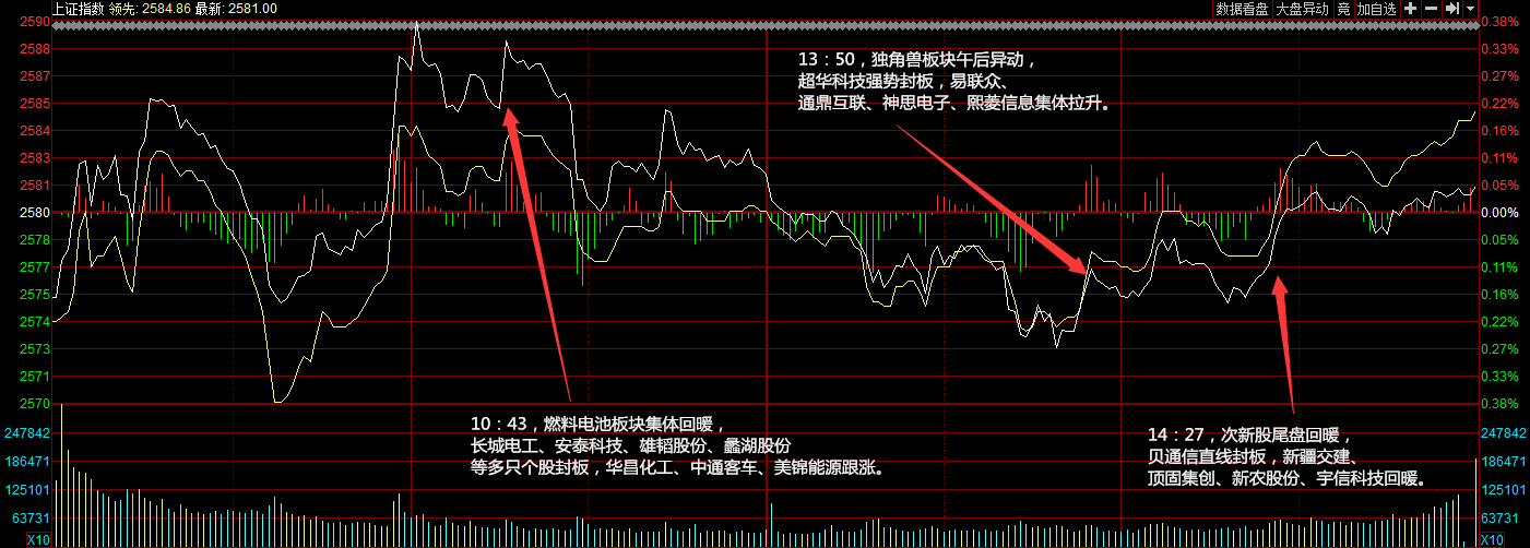 指数今日小幅低开,开盘后不久在燃料电池、汽车等板块的带领下,三大指数积极上攻一度翻红,但做多动能未能持续冲高回落。午后指数弱势盘整,创投、次新股轮番拉升,但未改两市横盘局面。个股涨跌参半。