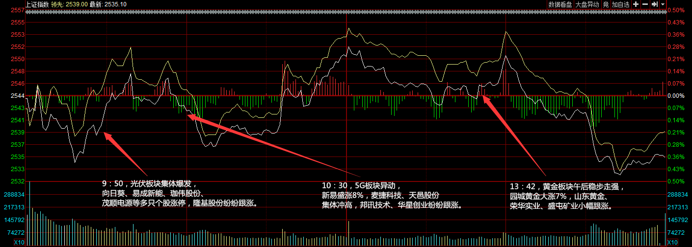 两市今日几近平开,早盘三大指数下探后集体回升翻红,光伏、5G概念领涨市场。午后两市冲高回落,黄金、抖音等概念有所表现但券商板块跳水拖累指数回落翻绿,市场赚钱效应较弱。
