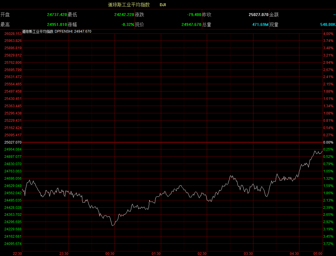美国股市收复早段跌势,三大指数收市窄幅上落。道指低开289点后愈跌愈急,至中段最多跌784点,其后跌势大幅回顺,全日收报24947点,跌79点。