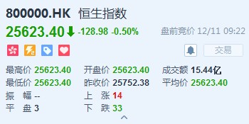 恒生指数开盘跌0.5%,报25623.4点。国企指数跌0.61%,报10210.31点。红筹指数跌0.15%,报4203.78点。大市盘前成交15.44亿港元。