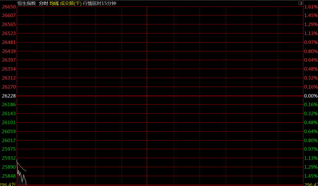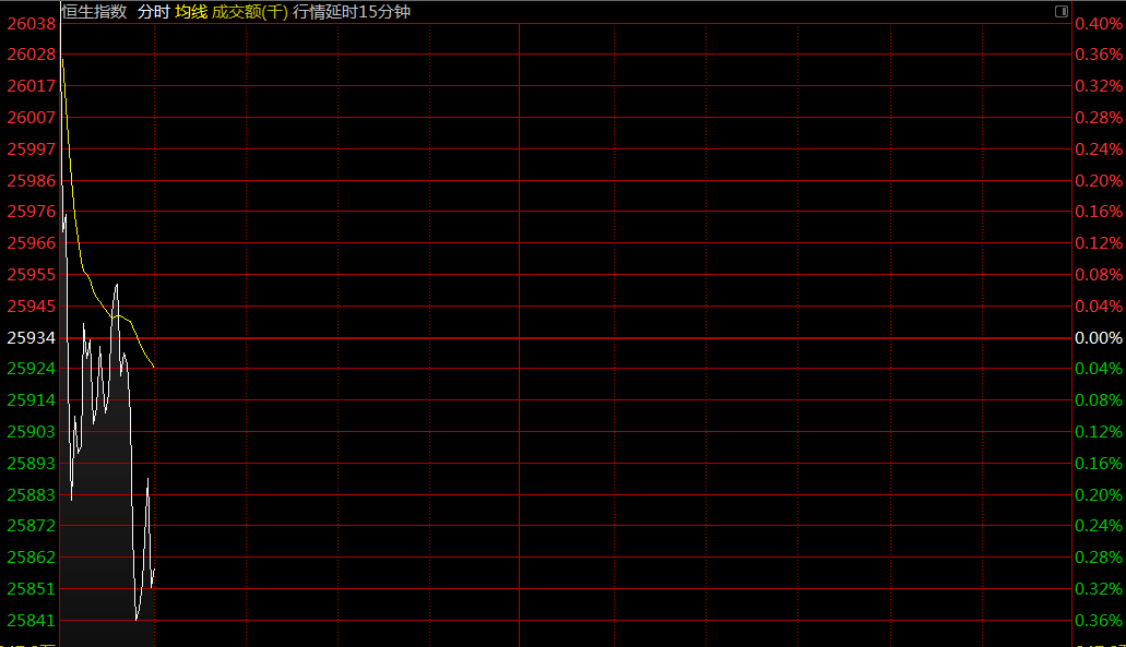 恒生指数开盘涨0.32%,报25874.36点。国企指数涨0.24%,报10503.81点。红筹指数涨0.44%,报4250.64点。大市盘前成交17.33亿港元。
