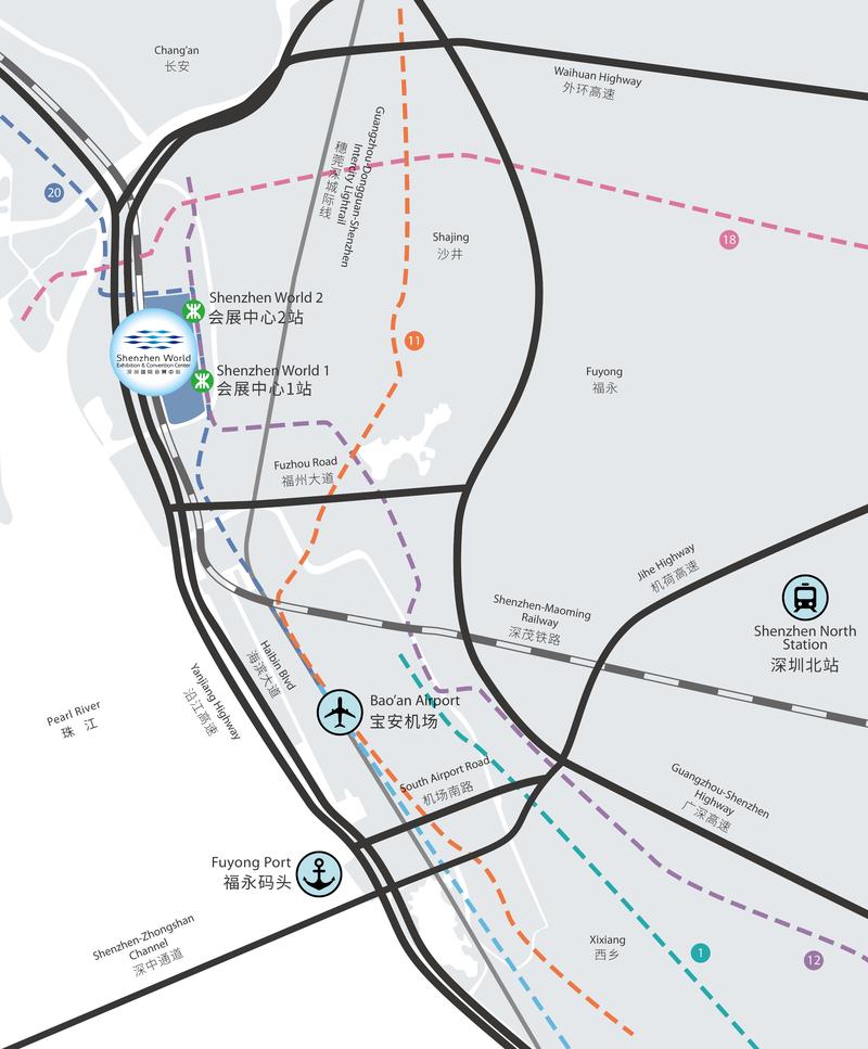 深圳国际会展中心地处宝安区福永的会展新城片区,占据粤港澳大湾区湾顶,区位优势突出。会展新城位于珠三角中心和广东自贸区中心、广深港核心发展走廊、东西向发展走廊的交汇处,同时也处在广佛肇、深莞惠、珠中江三大城市圈交汇处。深圳国际会展中心紧邻深圳宝安国际机场,毗邻福永码头,紧挨广深沿江高速,直通地铁,接驳城轨,享有极其便利的五维立体交通资源。得天独厚的区位条件、优越的经济发展环境、历史性的湾区发展机遇无疑将有力助推深圳国际会展中心惊艳绽放。