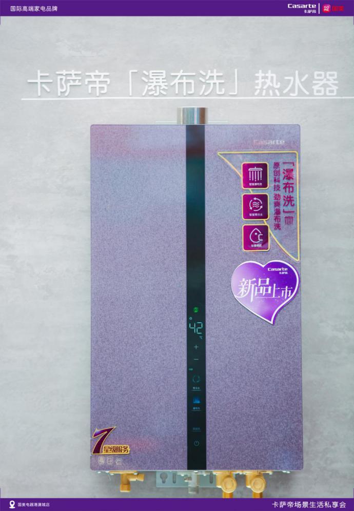 作为行业首台燃电混动的燃气热水器——卡萨帝银河混动热水器CT7,更是精准解决燃气热水器长久以来的痛点,缔造恒温静音的舒适沐浴体验。它创新科技融合电热双动力,精控微火恒温科技实时监测进水温度和进水流量,智能调节进气量,燃烧火力无缝切换确保水温不波动;另外,其一键开启“静音零冷水循环”模式“按摩瀑布洗”模式,灵活又便捷,仿佛在家就能享受一场水疗SPA。