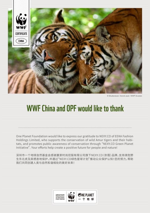 2021年,NEXY.CO携手WWF(世界自然基金会)和OPF(一个地球自然基金会)共同推出2021SS 【绿色星球】公益环保系列,踏出了绿色环保公益的关键一步。 NEXY.CO通过WWF和OPF,特别捐赠款项用于支持野生东北虎及其栖息地的专项保护,呼吁大家关注濒危野生动物及其栖息地保护,唤醒人们对自然的关爱。