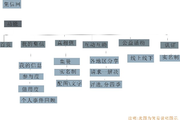 注册实名制会员(可以用个人名义,也可以用团体名义等)----查询个人或团体的相关集信信息(当中,有奖励制度,只限本人或团体可见)----展现会员发布的“好人好事”----互动互助(加强人与人之间的交流)----线下可组织公益主题活动