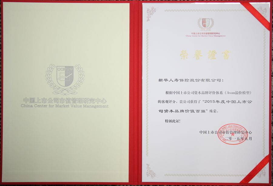 2015年5月,中国上市公司市值管理研究中心发布的”2015年度中国上市公司资本品牌价值百强“中,新华保险赫然上榜!