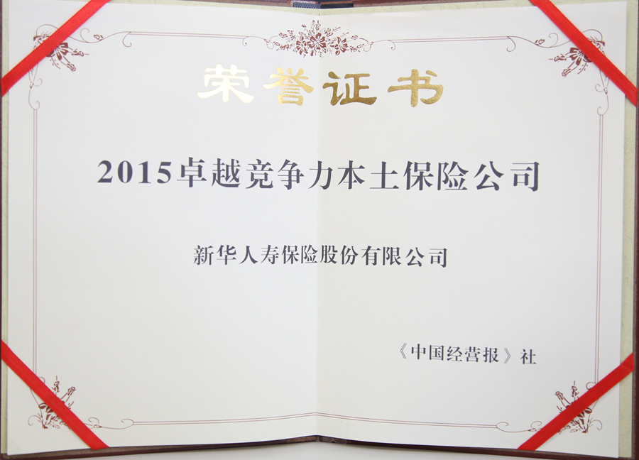 2015年12月,在由中国经营报主办的2015年度(第七届)卓越竞争力金融机构评选中,新华保险获得“2015卓越竞争力本土保险公司”奖。