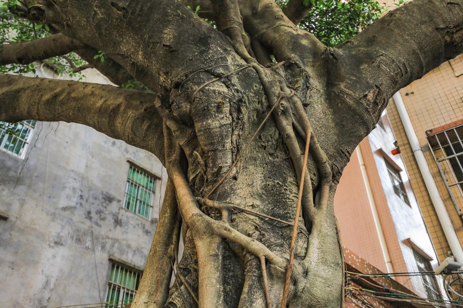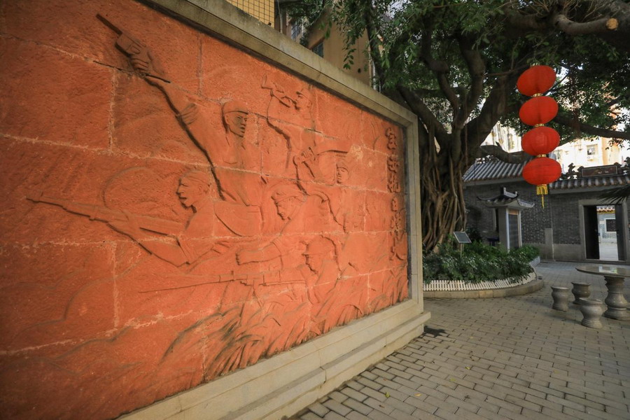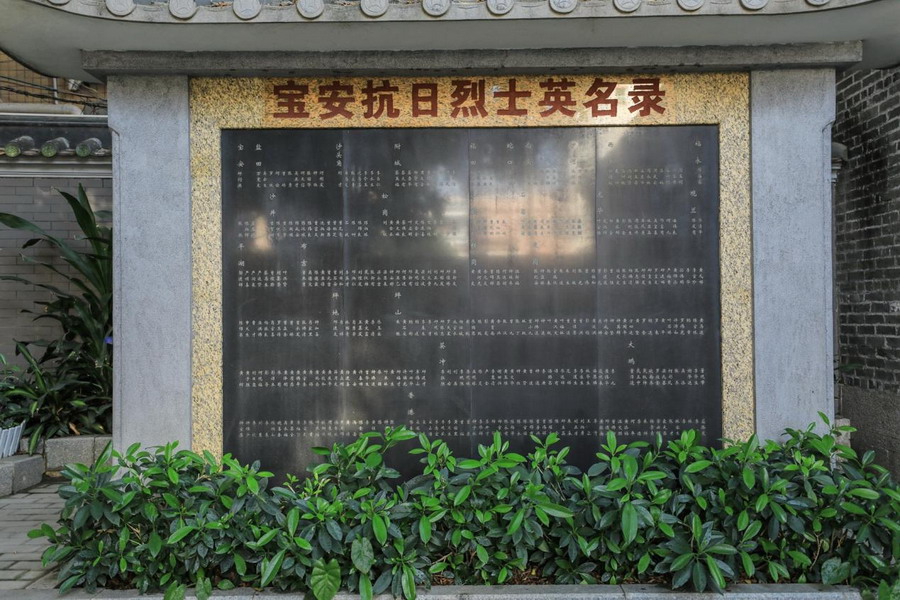 走进泽培陈公祠院内,左右边是《宝安抗日烽火展》的浮雕和宝安抗日烈士英名录,旁边有一棵枝叶繁茂的大榕树,当年,东宝行政督导处的领导们曾经在此练习枪法,树干里还留着当年的弹孔。随着岁月的洗礼,这些弹孔已经消失了,但是这个故事流传至今。
