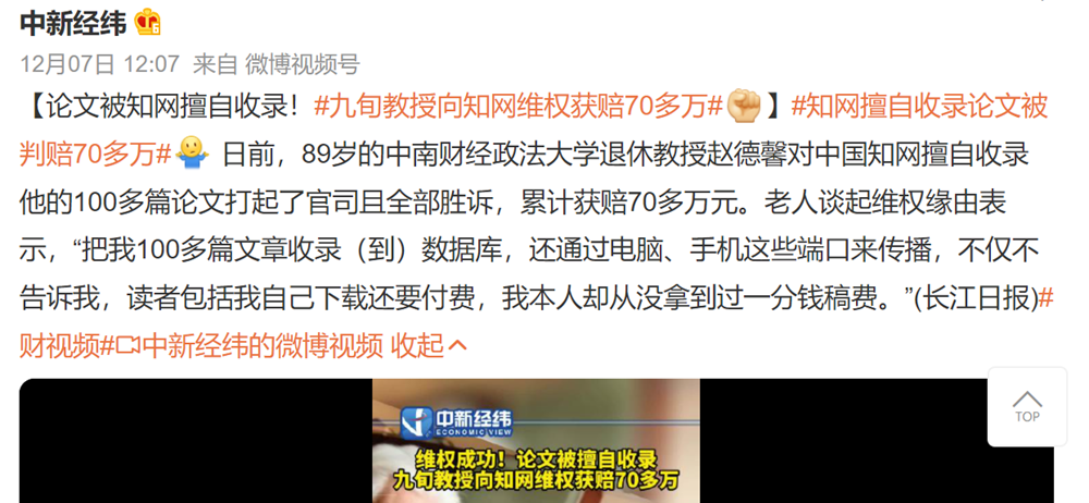 中南财经政法大学退休教授苏少之,赵德鑫教授的学生,后来以同样的方式打官司并胜诉。维权成功后,苏少之的论文也被中国知网下架了。有网友点评一针见血:中国知网是不是该把所有教授的账都结一下?