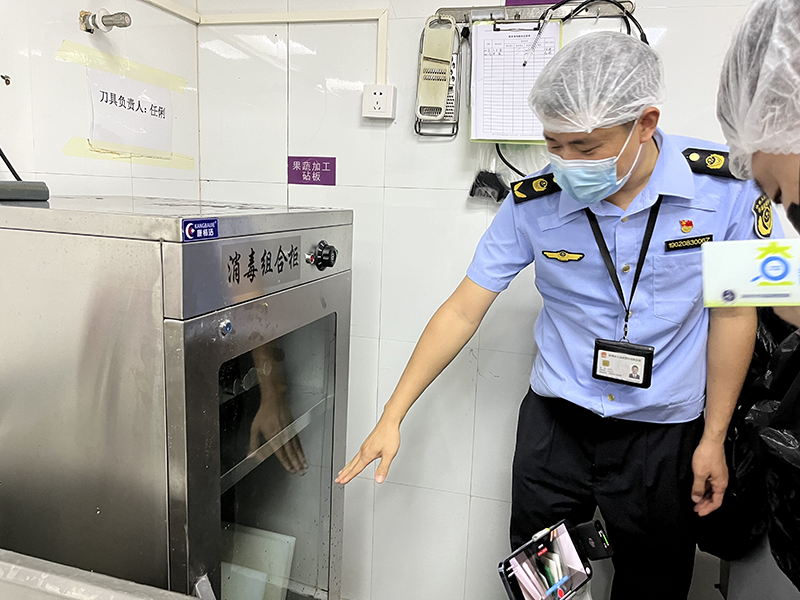 执法人员查看消毒柜中的砧板和刀具