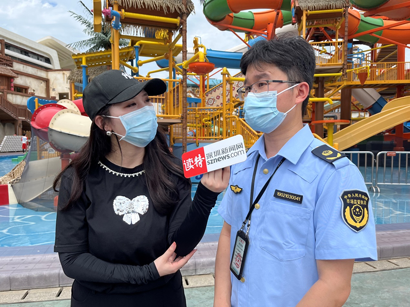 读特客户端·深圳新闻网2022年6月2日讯(记者 胡津玮 牛耘 翁瑞峰 袁征一方)临近端午,为保障广大游客朋友们假期期间出行安全放心,深圳市市场监督管理局大鹏监管局开展“大鹏市监节日查”专项执法行动。本期行动来到了大鹏新区热门景点——金沙湾佳兆业国际乐园水世界,针对这里的证照资质、设施设备、安全管理等情况开展市场经营行为进行重点检查。