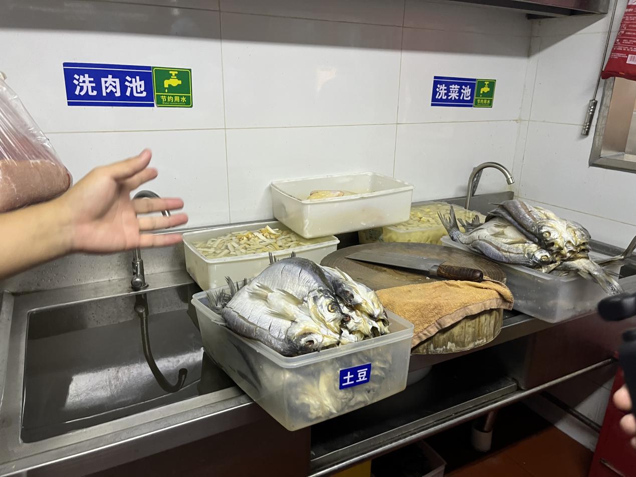 进入后厨,执法人员看到有待清洗的鱼类被放置在肉菜清洗池。他提醒餐厅后厨负责人,洗肉池和洗菜池不应放置鱼类,应尽快整改。