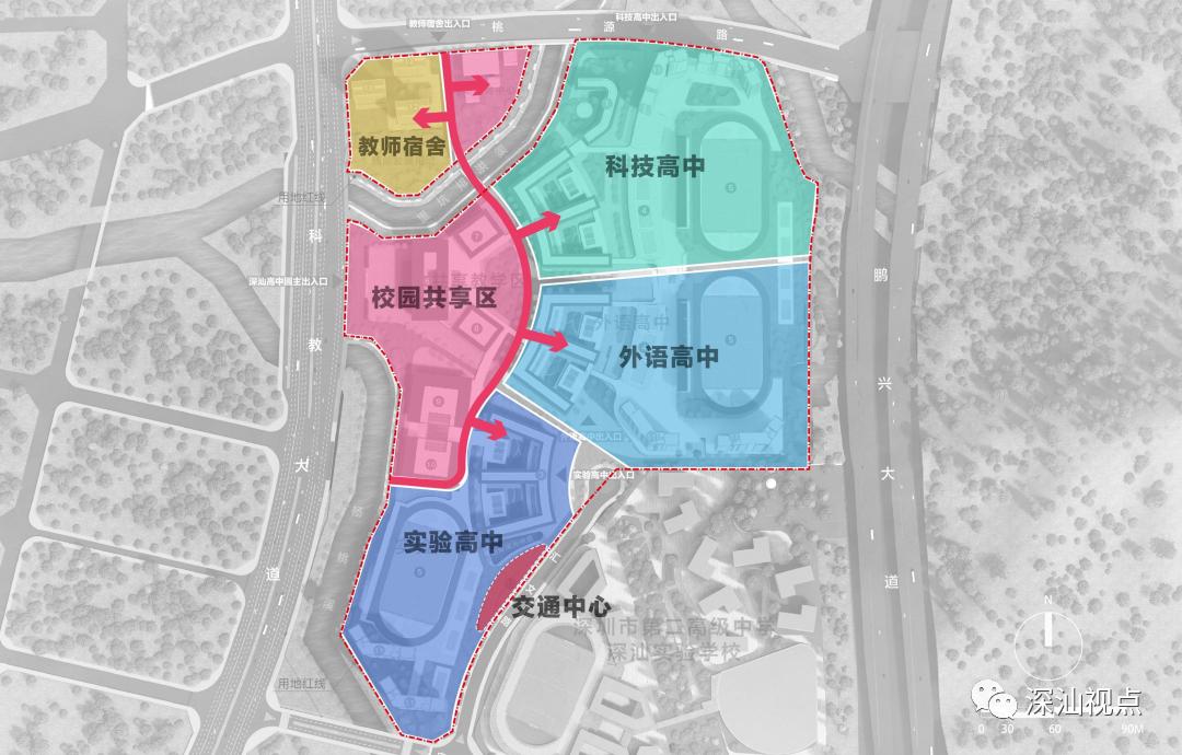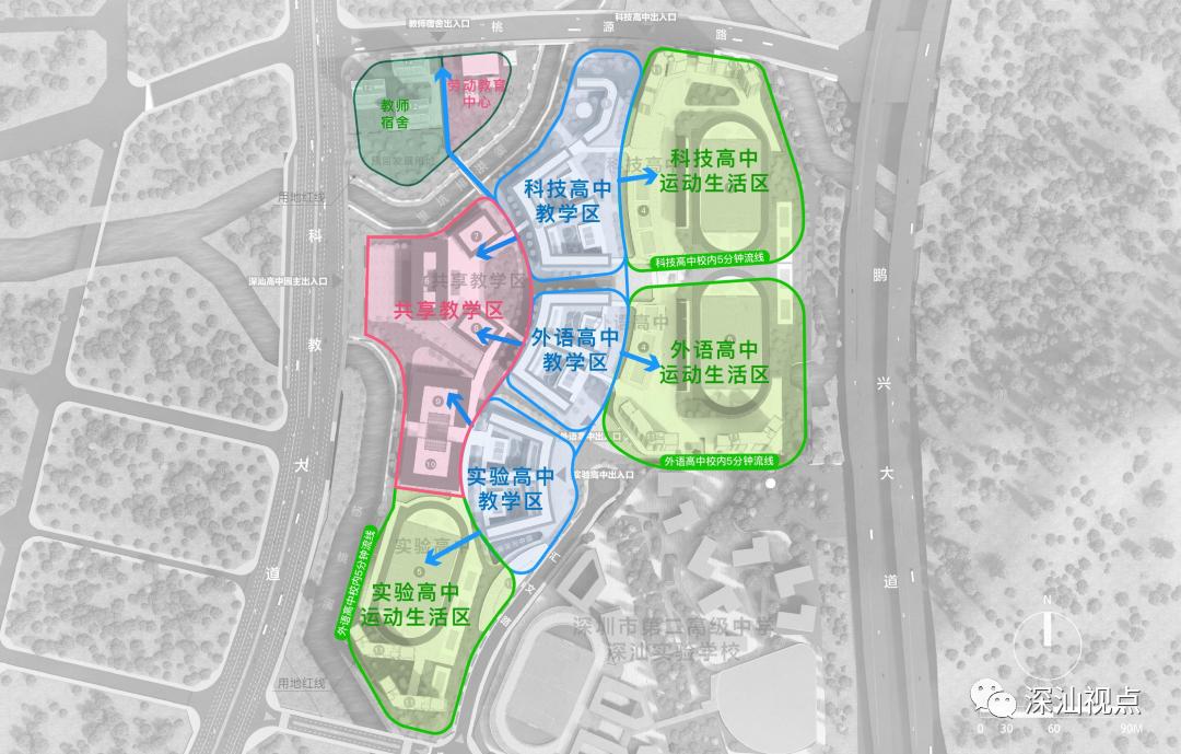 深圳中学高中园将新建科技高中、外语高中、实验高中3所寄宿制高级中学,项目采用“共享教学组团+独立教学组团”适应未来发展的功能组织模式,3所高中基本教学、生活、运动功能各自独立又高效连接,公共教学与特色教学于组团中央,可供整个高中园灵活使用,各功能组团布局均衡,形成5分钟教学生活圈。