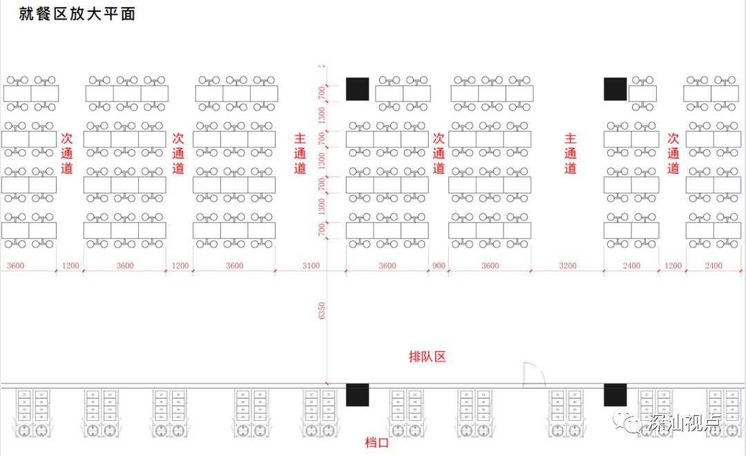 食堂方面,设计每个食堂面积4950平方米,根据校方分批就餐的管理模式共计2550人(学生2400人,教师150人)的食堂座位布局方案。