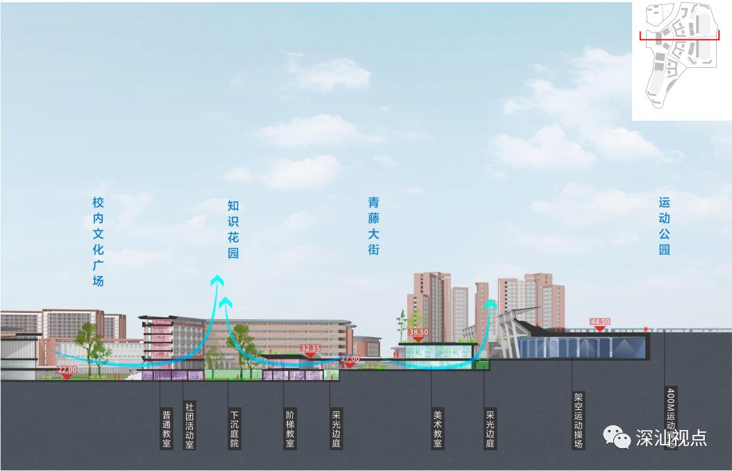 其中,多首层设计把校内文化广场、知识花园、青藤大街、运动公园等设施立体串连。