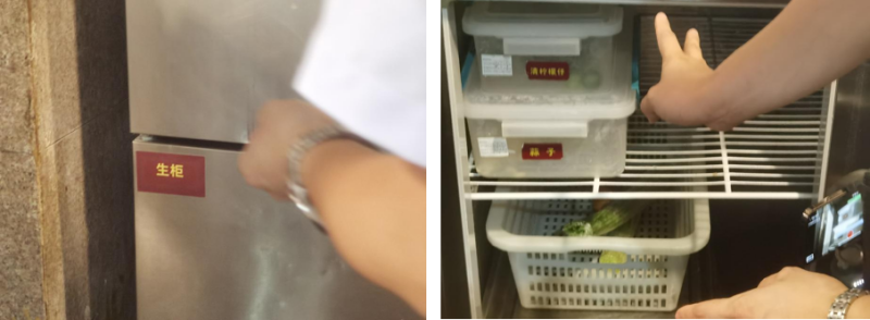 在检查后厨冰柜过程中,执法人员发现标签为“生柜”的冰柜中存放着半成品。同样的问题也发生在该餐厅三楼的后厨,标签为“熟肉柜”的冰柜中存在生熟肉混放的情况。执法人员提醒,食材应按照冰柜标签存放,做好分类,避免相互污染。