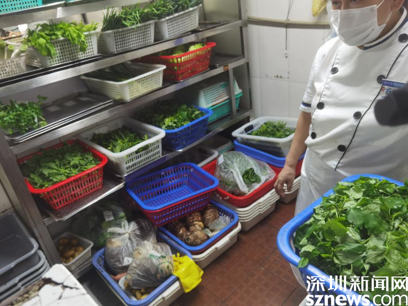 在蔬菜清洗区,执法人员发现部分蔬菜并没有摆放在架子上,而是直接放在地上。同样,在干调仓库,部分食品也直接摆放在地上。在干调仓库的角落,记者还注意到有一只死蟑螂。执法人员要求餐厅尽快整改,做好除四害工作,同时食品应摆放在架子上,避免地面的污染。