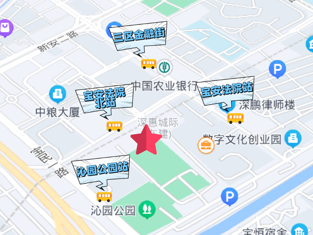 周边公共交通站点(仅供参考):宝安法院北站(公交B832路、B904路、M210路),三区金融街站(公交603路、605路、B832路、M210路),沁园公园站(公交603路、605路、B904路、M210路、395路),宝安法院站(公交395路、603路、605路、B904路、M210路)