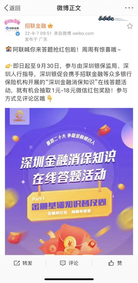 一方面,招联金融组织公司全体员工参与答题活动,鼓励员工转发朋友圈邀请客户、亲朋好友等共同参与答题活动;另一方面,依托招联金融在微博的92.4万粉丝量,借助微博平台进行答题活动的推广宣传,切实提高答题活动的覆盖面和影响力,从而有效提升广大消费者的金融素养。