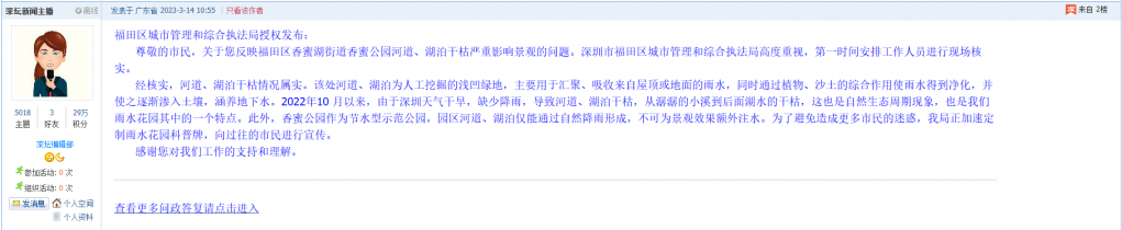 3、帖文《深圳香蜜公园南边的湖泊、小河都没水了呢?不知怎么回事呀?》