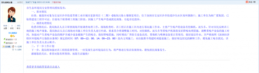 据统计,2023年3月6日—2023年3月12日,网友在深圳论坛发布问政类帖文共56篇,得到相关单位正式回应的帖文数为15篇。