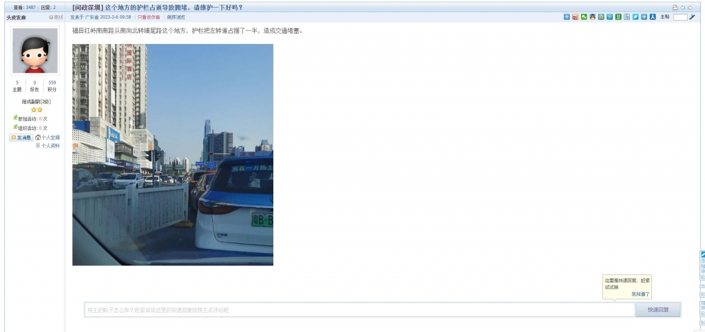 4、帖文《好堵,南坪往前海方向,请想办法解决好不》