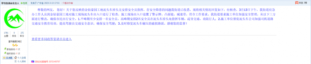 尊敬的网友, 您好!关于您反映的金钻豪园工地泥头车掉头无安排安全员指挥,存在安全隐患的问题我街道已收悉,现将相关情况回复如下:经核查,3月13日下午,我街道应急办工作人员到金钻豪园工地对施工现场泥头车出入口进行了检查,施工现场出入口设置了警示牌、凸面镜、减速带,符合工作要求。我街道要求施工单位加强安全管理,从以下三方面进行整改,确保市民出行安全。1.平峰期至少安排一名安全员,高峰期安排2名安全员在泥头车掉头处指挥车辆、疏导交通、劝阻行人;2.施工单位督促泥头车公司加强司机道路交通安全教育培训,增强驾驶员交通安全意识,确保安全驾驶;3.及时修复泥头车碾压的破损路面。感谢您的监督!