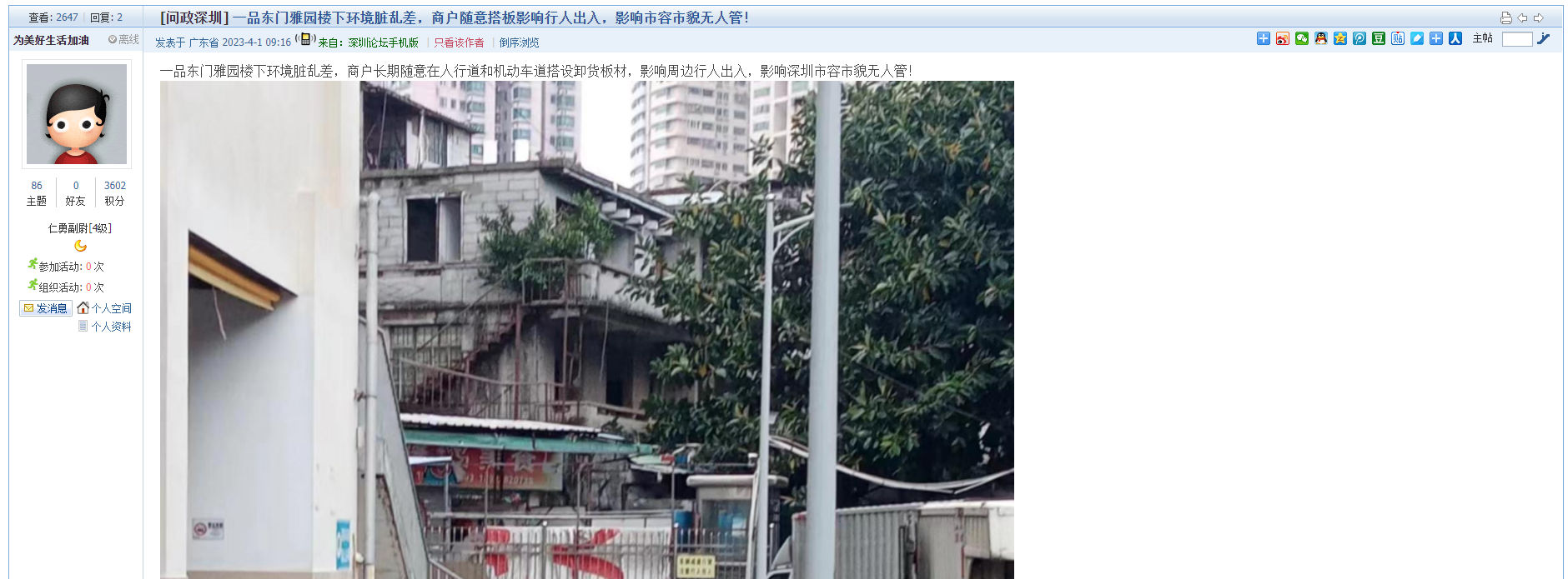 7、帖文《一品东门雅园楼下环境脏乱差,商户随意搭板影响行人出入,影响市容市貌无人管!》