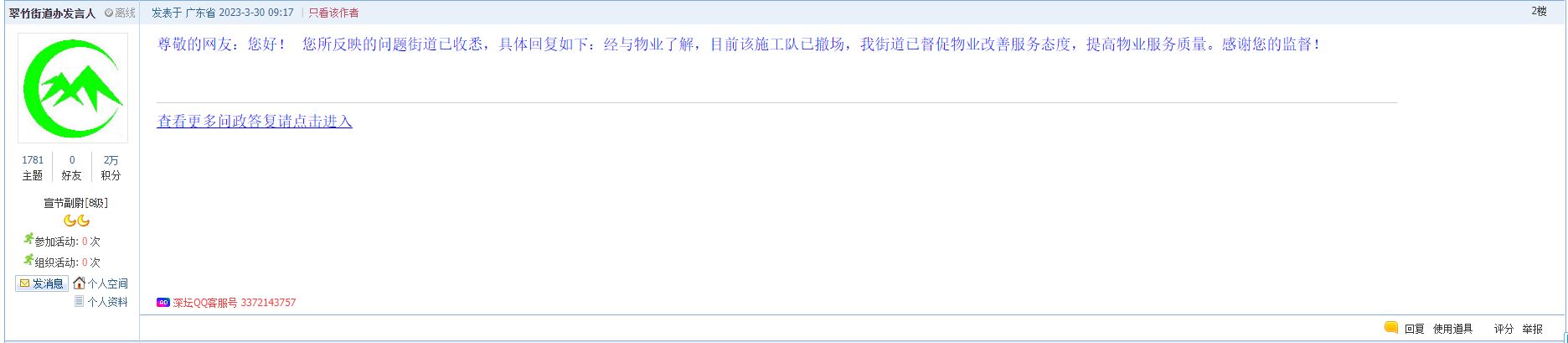 各职能单位如需对网友反映的问题进行回应,可在深圳论坛注册官方账号并通过认证,回帖进行回应,也可通过客服QQ以及热线电话,委托深圳论坛代为回应。