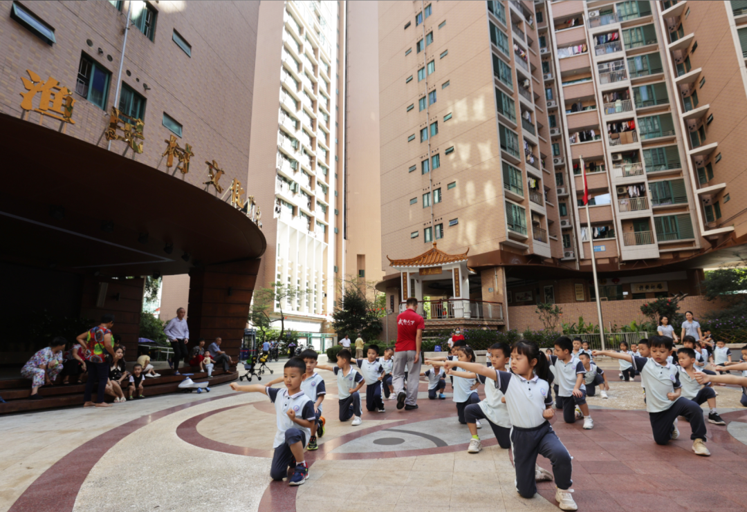 2021年10月11日,渔民村文化广场,渔民村幼儿园的孩子们正在训练武术。深圳特区报记者 杨浩翰 摄