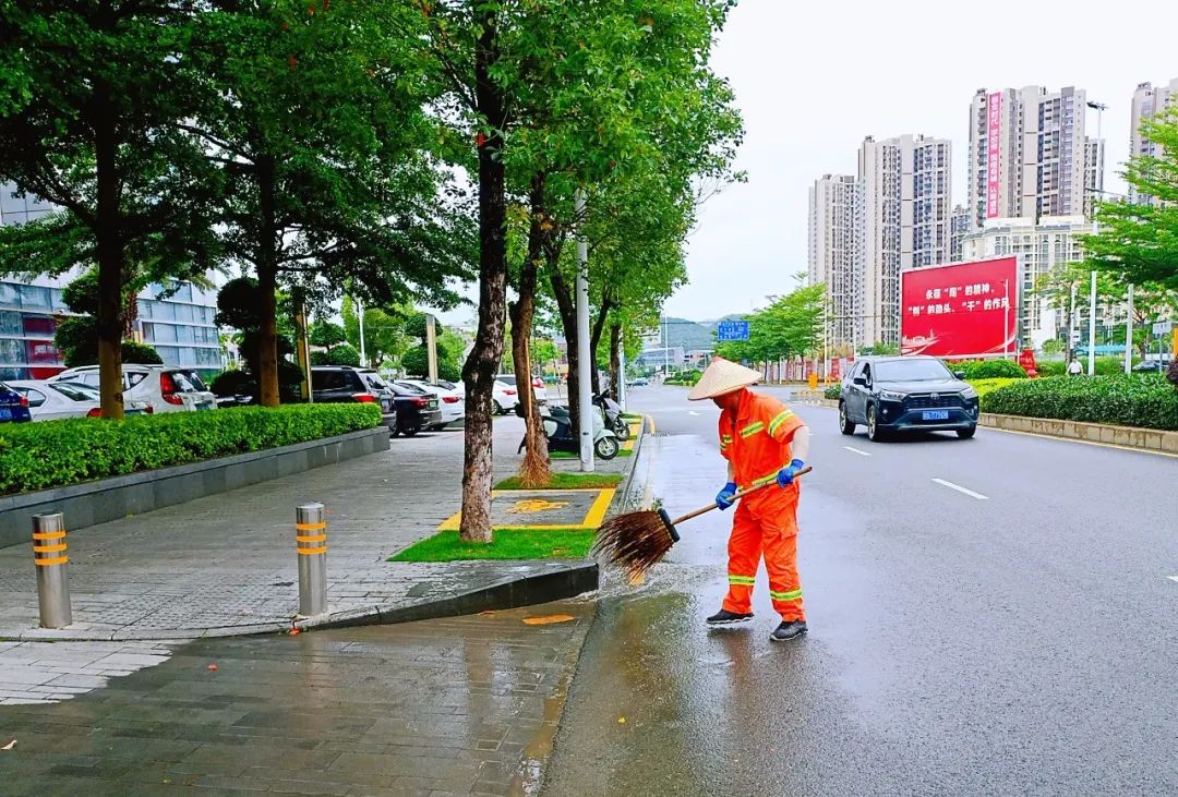 近日,一场短时强降雨突然来袭,辖区540余名环卫工友扑在一线,清扫路面,清理积水、落叶,保障环境卫生及群众出行。