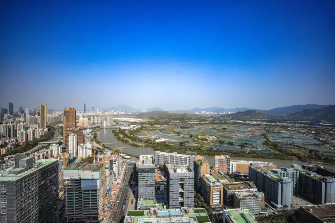 河套深港科技创新合作区地处深圳-香港边界区中部,面积3.89平方公里,拥有皇岗和福田“两大口岸”、保税区一号通道共三大通道,跨境直联互通,辐射大湾区。图为合作区俯视图。何龙 摄