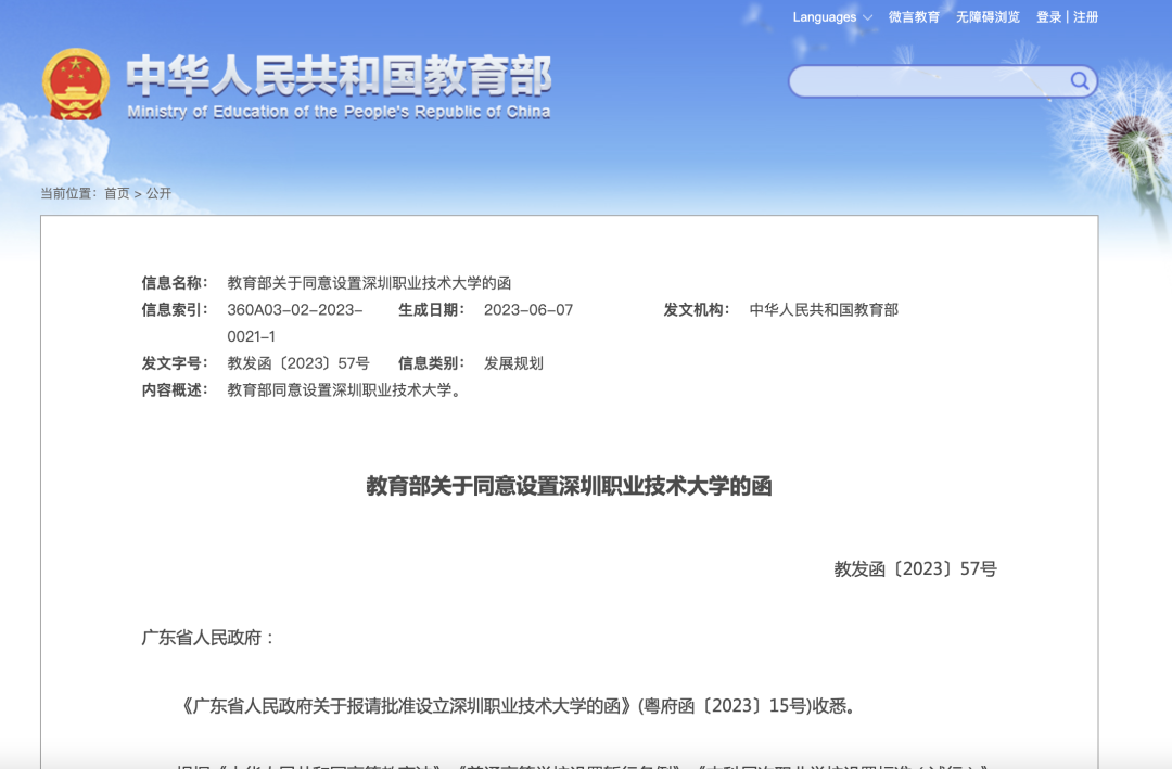 《教育部关于同意设置深圳职业技术大学的函》提到,同意以深圳职业技术学院为基础整合资源设立深圳职业技术大学,学校标识码为4144011113;同时撤销深圳职业技术学院的建制。这意味着,深圳职业技术学院正式升为本科大学。其中还提到,学校全日制在校生规模暂定为35000人。